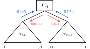 Note the distinction between subtree-local and total prefix sums. The points two, three and four can lead to believe they would form a circular dependency, but this is not the case. Lower level PEs might require the total prefix sum of higher level PEs to calculate their total prefix sum, but higher level PEs only require subtree local prefix sums to calculate their total prefix sum. The root node as highest level node only requires the local prefix sum of its left subtree to calculate its own prefix sum. Each PE on the path from PE0 to the root PE only requires the local prefix sum of its left subtree to calculate its own prefix sum, whereas every node on the path from PEp-1 (last PE) to the PEroot requires the total prefix sum of its parent to calculate its own total prefix sum.