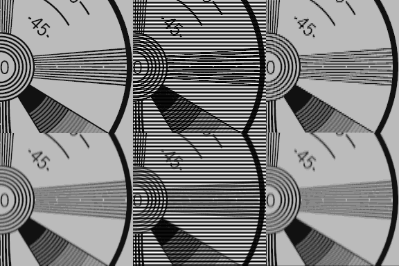 This rough animation compares progressive scan with interlace scan, also demonstrating the interline twitter effect associated with interlacing. On the left there are two progressive scan images. In the middle there are two interlaced images and on the right there are two images with line doublers. The original resolutions are above and the ones with spatial anti-aliasing are below. The interlaced images use half the bandwidth of the progressive ones. The images in the center column precisely duplicate the pixels of the ones on the left, but interlacing causes details to twitter. Real interlaced video blurs such details to prevent twittering, but as seen in the pictures of the lower row, such softening (or anti-aliasing) comes at the cost of image clarity. A line doubler shown in the bottom right picture cannot restore the previously interlaced image in the center to the full quality of the progressive image shown in the top left.