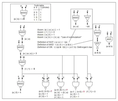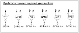 - ↑ As well as the first three, Hamilton pp.19-22 discusses logics built from only | (NAND), and ↓ (NOR).