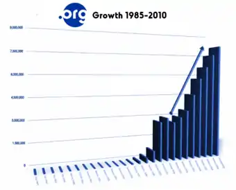 .ORG is the third largest generic top-level domain of the Domain Name System used in the internet. .ORG domains have been registered by Public Interest Registry since 2003. Craigslist.org and Wikipedia.org are among the more popular .org users.[4] Since 2009, Public Interest Registry has published a bi-annual report called "The Dashboard"[5] on the number of registered .ORG domains. There were more than 8 million registered .ORG in 2009,[4] 8.8 million in 2010,[6] and 9.6 million in 2011.[7] Public Interest Registry registered the ten millionth .org domain in June, 2012.[8] In June 2015 there were 10.5 million .org domains registered.[9]