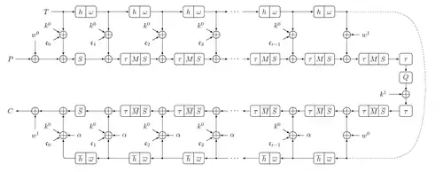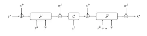 - for decryption, the same design can be used as long as k0+α is used as a core key, k1 = Q•k0, w1 and w0 are swapped. α here is a special constant and Q a special involutary matrix. This construct is similar to the alpha reflection in PRINCE.