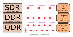 In a quad data rate system, the data lines operate at twice the frequency of the clock signal. This is in contrast to double data rate systems, in which the clock and data lines operate at the same frequency.[1]