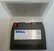 Quarter inch cartridge tape (abbreviated QIC, commonly pronounced "quick") is a magnetic tape data storage format introduced by 3M in 1972,[1] with derivatives still in use as of 2016. QIC comes in a rugged enclosed package of aluminum and plastic that holds two tape reels driven by a single belt in direct contact with the tape. The tape was originally 1⁄4 inch (6.35 mm) wide and anywhere from 300 to 1,500 feet (91 to 457 m) long. Data is written linearly along the length of the tape in one track[1] (mostly on pre-1980 equipment), or written "serpentine", one track at a time, the drive reversing direction at the end of the tape, and each track's data written in the opposite direction to its neighbor. Since its introduction, it has been widely used, and many variations exist. There is a QIC trade association that publishes QIC standards which include interfaces and logical formats. To a very large extent it was the efficiency and openness of this organization which encouraged hardware and software developers to use this type of drive and media.