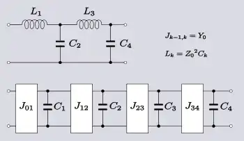 - ↑ The K and J notation originates in archaic symbols for impedance and admittance respectively. The K is the same K that makes an appearance in the well known constant-k filter and the K parameter is defined for inverters of lumped-element design in exactly the same way as it is defined for the constant-k filter. For a λ/4 transformer the difference is moot, the same device will serve as a K-inverter with an inverter parameter of K=Z0 or equally as a J-inverter with an admittance inverter parameter of J=Y0, the characteristic admittance (=1/Z0).