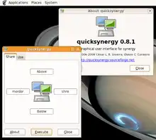 QuickSynergy is a graphical interface (GUI) for OS X and Linux for easily configuring Synergy. Synergy is an application that allows the user to share the mouse and keyboard between two or more computers. Without the need for any external hardware, Synergy uses the TCP/IP protocol to share the keyboard and mouse, between machines with different operating systems, such as Mac OS, Linux, and Windows.