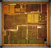 The R10000 consists of approximately 6.8 million transistors, of which approximately 4.4 million are contained in the primary caches.[2] The die measures 16.640 by 17.934 mm, for a die area of 298.422 mm2. It is fabricated in a 0.35 µm process and packaged in 599-pad ceramic land grid array (LGA). Before the R10000 was introduced, the Microprocessor Report, covering the 1994 Microprocessor Forum, reported that it was packaged in a 527-pin ceramic pin grid array (CPGA); and that vendors also investigated the possibility of using a 339-pin multi-chip module (MCM) containing the microprocessor die and 1 MB of cache.[3]
