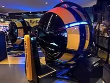 The R360 was designed by Sega AM2.[1] Its name is short for "Rotate 360", representative of the cabinet's ability to spin 360 degrees in any direction.[2] Physically, the unit is 7 feet (210 cm) in diameter and 8 feet (240 cm) tall. It weighs over 2,200 pounds (1,000 kg), and utilizes a 20-inch (51 cm) monitor for gameplay. The cabinet is mounted on a gyroscope that can rotate along two axes, attached to a base which is stationery.[3]