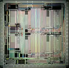 The streaming cache's tags are contained on two Tag RAM chips, one for each bank. Both chips contain identical data. Each chip contains 1.189 Mbit of cache tags implemented by four-transistor SRAM cells. The chips are implemented in a 0.7 μm BiCMOS process with two levels of polysilicon and two levels of aluminium interconnect. BiCMOS circuitry was used in the decoders and combined sense amplifier and comparator portions of the chip to reduce cycle time. Each Tag RAM is 14.8 mm by 14.8 mm large, packaged in a 155-pin CPGA, and dissipates 3 W at 75 MHz.[6] In addition to providing the cache tags, the Tag RAMs are responsible for the streaming cache being four-way set associative. To avoid high a pin count, the cache tags are four-way set associative and logic selects which set to access after lookup instead of the usual way of implementing set-associative caches.[1]