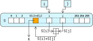 - exchanges the values of S[i] and S[j], then uses the sum S[i] + S[j] (modulo 256) as an index to fetch a third element of S (the keystream value K below);