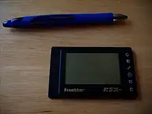 The Franklin REX 5, (also known as the “Rex-Pro”, as the “Rex 5000”, and with cosmetic variation as the “Rex 5001”) was one of the Rex line of Personal Digital Assistants, each a PCMCIA PC card and thus the size of a credit card, built around a Toshiba microprocessor emulating a Zilog Z80. The REX firmware was written by Starfish Software, and the hardware was manufactured by Citizen Electronics. Earlier models in this line (the Rex and the Rex-3) had almost no input possibilities except to download data when installed in a host computer or in a docking station; the Rex 5 added a sixth button and introduced a modal input method. (The later REX 6000 again had only five buttons, but included a touch screen.) Further, with 512 KB of RAM, the Rex 5 had twice the memory of the Rex-3 (which, in turn, had four times that of the original Rex).