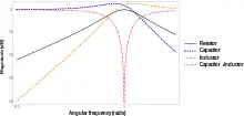 From the frequency response of the current, the frequency response of the voltages across the various circuit elements can also be determined (see figure). Moreover, the maximum voltage across the capacitor happens at a frequency