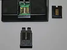 A ROM cartridge, usually referred to in context simply as a cartridge, cart, or card, is a replaceable part designed to be connected to a consumer electronics device such as a home computer, video game console or, to a lesser extent, electronic musical instruments.[1]