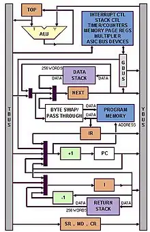It is a two-stack machine, each stack 256 words deep, that supports direct execution of Forth. Subroutine calls and returns only take one processor cycle and it also has a very low and consistent interrupt latency of only four processor cycles, which lends it well to realtime applications.