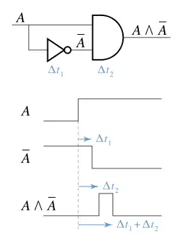A logic signal on one input and its negation, (the ¬ is a Boolean negation), on another input in theory never output a true value: . If, however, changes in the value of take longer to propagate to the second input than the first when changes from false to true then a brief period will ensue during which both inputs are true, and so the gate's output will also be true.[2]