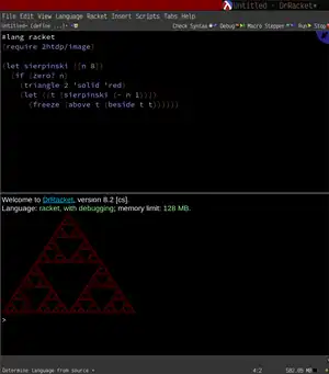 This program, taken from the Racket website, draws a Sierpinski triangle, nested to depth 8.