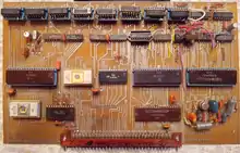 The circuitry of the Radio-86RK contains only 29 chips and was relatively easy to assemble. However, finding the chips to buy was difficult, as they were scarce and sold in small volumes in major cities of the USSR.[9] It was particularly difficult to find the KR580VG75 video chip, which was produced only in small quantities. This led to the development of a replacement video circuit[10] which contained 19 chips on a separate board, and was similar to the display module of the Micro-80 computer.