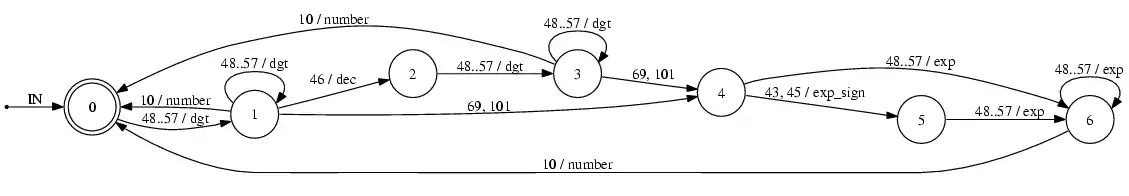 The above graph represents a state-machine that takes user input as a series of bytes representing ASCII characters and control codes. 48..57 is equivalent to the regular expression [0-9] (i.e. any digit), so only sequences beginning with a digit can be recognised. If 10 (line feed) is encountered, we're done. 46 is the decimal point ('.'), 43 and 45 are positive and negative signs ('+', '-') and 69/101 is uppercase/lowercase 'e' (to indicate a number in scientific format). As such it will recognize the following properly: