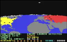 The game opens with an alert that a nuclear missile has been launched from a Soviet city towards a North American city.[6][7] The game begins in the hangar where the American spaceplanes are stored. The player has to safely fly the craft out.[7] The view switches to the earth as seen from low Earth orbit, and the player guides the spaceplane to the city launching the attack. Alternatively, the player may decide to maneuver more of the available spaceplanes out of the space station before attacking the launch site;[6] the surplus planes are docked outside the space station.[7] Meanwhile, the clock is ticking, and the time before impact is continually displayed.