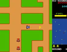 Rally-X is a maze chase game where the player controls a blue Formula One racecar. The objective is to collect yellow flags that are scattered around an enclosed maze while avoiding collision with red-colored cars that pursue the player.[6] Mazes scroll in the four cardinal directions and are clustered with dead ends, long corridors, and stationary boulders that are harmful to the player.[6][7] Each level contains ten flags that increase their point value when collected in succession.[8] One of the flags is a "Special Flag", indicated by an S next to it, which doubles the value of each flag collected thereafter.[7][8] The player can temporarily stun the red cars with smoke screens, which depletes a portion of their fuel meter at the right of the screen.[9][7] The meter constantly depletes the longer the player takes in a level, and acts as a timer.[7] As the game progresses, more red cars are added and become more aggressive.[7]