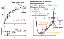 - Friedman-Savage procedure: Sequentially search each parameter with a set of guesses that have a space pattern between the initial guess and the boundaries.[5] An example of exponentially distributed steps can be found here in a MATLAB code (JCFit @ GitHub).[2] This example code converges 1-2 orders of magnitude slower than the Levenberg–Marquardt algorithm, with an example also provided in the GitHub.