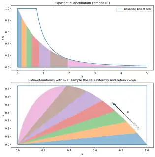 The ratio of uniforms is a method initially proposed by Kinderman and Monahan in 1977[1] for pseudo-random number sampling, that is, for drawing random samples from a statistical distribution. Like rejection sampling and inverse transform sampling, it is an exact simulation method. The basic idea of the method is to use a change of variables to create a bounded set, which can then be sampled uniformly to generate random variables following the original distribution. One feature of this method is that the distribution to sample is only required to be known up to an unknown multiplicative factor, a common situation in computational statistics and statistical physics.