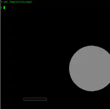 P[500,300],F(C[+100]) then moves to a new location, and uses the "F"ill command to wrap a "C"ircle. The fill command could wrap any number of commands within its parentheses, allowing it to fill complex shapes. It also allowed the inclusion of a "temporary write" that allowed the programmer to set the fill style within the fill, and abandon it as soon as it ended.