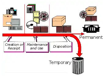 Records life-cycle in records management refers to the following stages of a records "life span": from its creation to its preservation (in an archives) or disposal. While various models of the records life-cycle exist, they all feature creation or receipt, use, and disposition.[2]