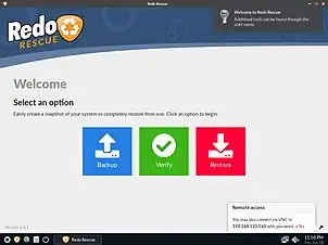 Redo Rescue, formerly Redo Backup and Recovery, is a free backup and disaster recovery software. It runs from a bootable Linux CD image, features a GUI that is a front end to the Partclone command line utility, and is capable of bare-metal backup and recovery of disk partitions. It can use external hard drives and network shares.