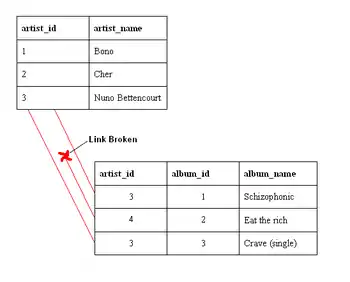 artist_id) value in the album table that references a non-existent artist — in other words there is a foreign key value with no corresponding primary key value in the referenced table. What happened here was that there was an artist called "Aerosmith", with an artist_id of 4, which was deleted from the artist table. However, the album "Eat the Rich" referred to this artist. With referential integrity enforced, this would not have been possible.For referential integrity to hold in a relational database, any column in a base table that is declared a foreign key can only contain either null values or values from a parent table's primary key or a candidate key.[2] In other words, when a foreign key value is used it must reference a valid, existing primary key in the parent table. For instance, deleting a record that contains a value referred to by a foreign key in another table would break referential integrity. Some relational database management systems (RDBMS) can enforce referential integrity, normally either by deleting the foreign key rows as well to maintain integrity, or by returning an error and not performing the delete. Which method is used may be determined by a referential integrity constraint defined in a data dictionary.