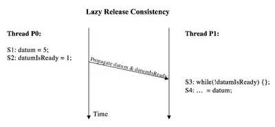 The second image displays what is the case when lazy release consistency is applied. Considering this scenario, all values written ahead of the release synchronization are delayed and propagated together with the propagation of the release access itself. Hence, datum and datumIsReady are propagated together at the release point.