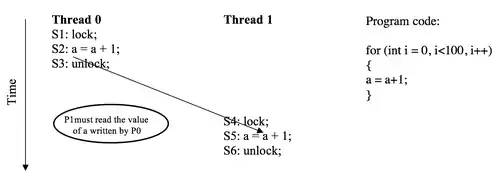 A lock release can be considered as a type of release synchronization. Assume a loop operation is performed using the code shown to the right. Two threads intend to enter a critical section and read the most recent value of a, then exit the critical section. The code shows that thread 0 first acquires the lock and enters the critical section. In order to execute correctly, P1 must read the latest value of a written by P0. In that case, only one thread can be in the critical section at a time. Therefore, the synchronization itself has ensured that the successful lock acquisition at P1 occurs after lock release by P0. Besides, the S2 -> S3 ordering has to be ensured, since the P0 must propagate the new value of a to P1. For the same reason, S5 must occur after S4.[3]