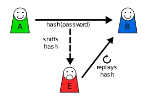 Suppose Alice wants to prove her identity to Bob. Bob requests her password as proof of identity, which Alice dutifully provides (possibly after some transformation like hashing, or even salting, the password); meanwhile, Eve is eavesdropping on the conversation and keeps the password (or the hash). After the interchange is over, Eve (acting as Alice) connects to Bob; when asked for proof of identity, Eve sends Alice's password (or hash) read from the last session which Bob accepts, thus granting Eve access.[2]