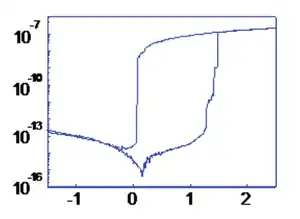 The basic idea is that a dielectric, which is normally insulating, can form a conduction path after application of a sufficiently high voltage.[29] The conduction path can arise from different mechanisms, including vacancy or metal defect migration. Once the conduction path is formed, it may be reset (broken, resulting in high resistance) or set (re-formed, resulting in lower resistance) by another lower voltage. Many current paths, rather than a single filament, are possibly involved.[30] The presence of these current paths in the dielectric can be in situ demonstrated via conductive atomic force microscopy.[29][31][32][33]