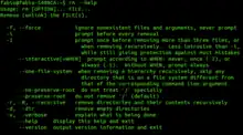 -r, "recursive," which removes directories, removing the contents recursively beforehand (so as not to leave files without a directory to reside in).-i, "interactive" which asks for every deletion to be confirmed.-f, "force," which ignores non-existent files and overrides any confirmation prompts (effectively canceling-i), although it will not remove files from a directory if the directory is write-protected.-v, "verbose," which prints whatrmis doing onto the terminal-d, "directory," which deletes an empty directory, and only works if the specified directory is empty.--one-file-system, only removes files on the same file system as the argument, and will ignore mounted file systems.