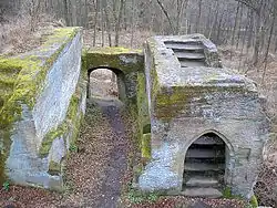 Castle researcher Otto Piper used the German phrase ausgehauene Burg (literally: "hewn-out castle") for castles that had rooms artificially hewn out of the rock on which the castle stood.[1] His examples of such rock-hewn castles include Fleckenstein, Trifels and Altwindstein. From a constructional point of view there is a close relationship with cave castles, which are also often enhanced with rooms artificially cut out of the rock.