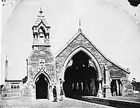 Rookwood was served by a rail spur from the main line from 1867 until 1948. Mortuary stations served each of the three sections of the necropolis, with a fourth at the main junction and a fifth on Regent Street adjacent to Central station. The railway line construction began in November 1864 and from 1 January 1865, trains began their run into the cemetery. It stopped at prearranged stations on the journey from central Sydney in order to pick up mourners and coffins. Trains ran at 9.30am and 3pm. The trains that carried the mourners were known as 'unimproved Redferns'[10] There were two types of Hearse carriages used for the procession. One consisted of a four-wheeled van that carried up to 10 coffins on its upper and lower shelves. Each of these shelves was designed so it could open onto the platform. There were also eight-wheeled vans that could hold 30 coffins. Both of these vehicles were attached the back of the train for transporting to the cemetery. At the terminus inside the cemetery the coffins were unloaded using 'wheeled hand-propelled litters'[11] The rail line was used to convey funeral parties to Rookwood until 1948 when the expanded use of processions by road made it obsolete. The stations were offered to the Joint Committee of Necropolis Trustees for the price of £1 but due to maintenance costs the offer was rejected and the platforms within the cemetery were demolished. Cemetery Station No. 1[9] at the head of the rail spur was sold to Reverend Buckle for £100 in 1951 and was moved to Canberra in 1957 to become the All Saints Church, Canberra.[12]