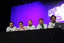 In 2006, Rooster Teeth partnered with Maybeck Productions to create PANICS, a short series filmed on F.E.A.R. that chronicles the misadventures of Bravo Team, a group of soldiers sent to investigate a paranormal disturbance.[78] The four publicly released episodes were released between September 27, 2005, and October 18, 2005,[80] and a prequel was released with F.E.A.R. – Director's Edition.[81] The mini-series won an award for Best Writing at the 2005 Machinima Film Festival.[79] Rooster Teeth's other machinima productions are 1-800-Magic, a four-episode mini-series created in 2006 using the game Shadowrun, and Supreme Surrender, a 2008 mini-series made using Supreme Commander. On February 13, 2017, Rooster Teeth premiered the teaser trailer for their upcoming animated series titled Sex Swing featuring members of their Funhaus division based on a recurring joke in their videos where they portray a fictional band of the same name.[82]