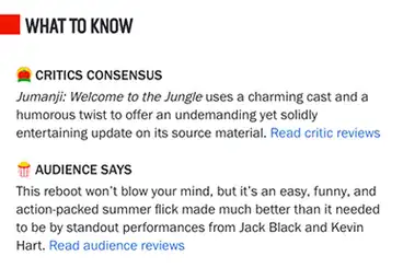 In February 2021, a new "What to Know" section was created for each film entry, combining the "Critics Consensus" and a new "Audience Says" blurbs within it, to give users an at-a-glance summary of the general sentiments of a film as experienced by critics and audiences.[35] Prior to February 2021, only the "Critics Consensus" blurb was posted for each entry, after enough certified critics had submitted reviews.[43] When the "Audience Says" blurbs were added, Rotten Tomatoes initially included them only for newer films and those with a significant audience rating, but suggested that they may later add them for older films as well.[35]