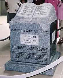 A month after his election, Moore began making plans for a large monument to the Ten Commandments, believing that the Heflin-Torbert Judicial Building required something grander than a wooden plaque. His final design involved a 5,280-pound (2,390 kg) granite block, three feet (0.91 m) wide by three feet deep by four feet (1.2 m) tall, covered with quotes from the Declaration of Independence, the national anthem, and several founding fathers.[40] The crowning element would be two large carved tablets inscribed with the Ten Commandments. High-grade granite from Vermont was ordered and shipped, and Moore found benefactors and a sculptor to complete the job. Moore's actions were made without the consent or knowledge of the eight associate justices.[41][42]