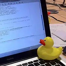 In software engineering, rubber duck debugging (or rubberducking) is a method of debugging code by articulating a problem in spoken or written natural language. The name is a reference to a story in the book The Pragmatic Programmer in which a programmer would carry around a rubber duck and debug their code by forcing themselves to explain it, line by line, to the duck.[1] Many other terms exist for this technique, often involving different (usually) inanimate objects, or pets such as a dog or a cat. Teddy bears are also widely used.[2] When humans are involved, it is known as confessional programming.[3]