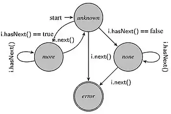 does not occur, it is very possible that a user will iterate "off the end of" a Collection. The figure to the right shows a finite state machine that defines a possible monitor for checking and enforcing this property with runtime verification. From the unknown state, it is always an error to call the next() method because such an operation could be unsafe. If hasNext() is called and returns true, it is safe to call next(), so the monitor enters the more state. If, however, the hasNext() method returns false, there are no more elements, and the monitor enters the none state. In the more and none states, calling the hasNext() method provides no new information. It is safe to call the next() method from the more state, but it becomes unknown if more elements exist, so the monitor reenters the initial unknown state. Finally, calling the next() method from the none state results in entering the error state. What follows is a representation of this property using parametric past time linear temporal logic.