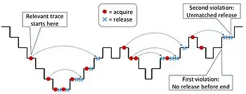 The pattern specifies balanced sequences of nested begin/end and acquire/release pairs for each Thread and Lock ( is the empty sequence). Here begin and end refer to the begin and end of every method in the program (except the calls to acquire and release themselves). They are parametric in the Thread because it is necessary to associate the beginning and end of methods if and only if they belong to the same Thread. The acquire and release events are also parametric in the Thread for the same reason. They are, additionally, parametric in Lock because we do not wish to associate the releases of one Lock with the acquires of another. In the extreme, it is possible that there will be an instance of the property, i.e., a copy of the context-free parsing mechanism, for each possible combination of Thread with Lock; this happens, again, intuitively, because runtime verification systems may implement the same functionality differently. For example, if a system has Threads , , and with Locks and , then it is possible to have to maintain property instances for the pairs <,>, <,>, <,>, <,>, <,>, and <,>. This property should be monitored for failures to match the pattern because the pattern specified correct behavior. The figure to the right shows a trace that produces two violations of this property. The steps down in the figure represent the beginning of a method, while the steps up are the end. The grey arrows in the figure show the matching between given acquires and releases of the same Lock. For simplicity, the trace shows only one Thread and one Lock.