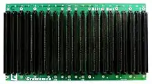 The S-100 bus is a passive backplane of 100-pin printed circuit board edge connectors wired in parallel. Circuit cards measuring 5 in × 10 in (13 cm × 25 cm) serving the functions of CPU, memory, or I/O interface plugged into these connectors. The bus signal definitions closely follow those of an 8080 microprocessor system, since the Intel 8080 microprocessor was the first microprocessor hosted on the S-100 bus. The 100 lines of the S-100 bus can be grouped into four types: 1) Power, 2) Data, 3) Address, and 4) Clock and control.[1]