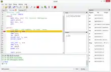 SASM (short for SimpleASM) is a free and open source cross-platform integrated development environment for the NASM, MASM, GAS and FASM assembly languages. It features syntax highlighting and includes a debugger.[1]