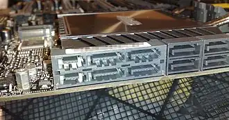 SATA Express (sometimes unofficially shortened to SATAe) is a computer bus interface that supports both Serial ATA (SATA) and PCI Express (PCIe) storage devices, initially standardized in the SATA 3.2 specification.[1] The SATA Express connector used on the host side is backward compatible with the standard SATA data connector,[2] while it also provides two PCI Express lanes as a pure PCI Express connection to the storage device.[3]