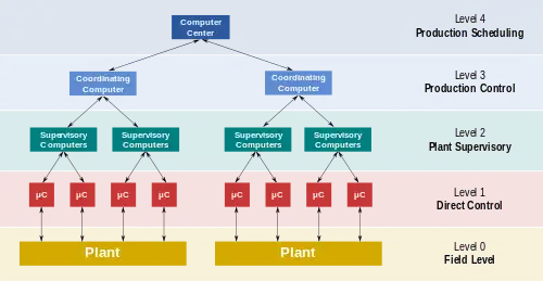 - Level 3 is the production control level, which does not directly control the process, but is concerned with monitoring production and targets.