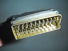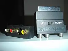SCART (also known as Péritel or Péritélévision, especially in France, 21-pin EuroSCART in marketing by Sharp in Asia, Euroconector in Spain,[1] EuroAV or EXT, or EIA Multiport in the United States, as an EIA interface) is a French-originated standard and associated 21-pin connector for connecting audio-visual (AV) equipment. The name SCART comes from Syndicat des Constructeurs d'Appareils Radiorécepteurs et Téléviseurs, "Radio and Television Receiver Manufacturers' Association", the French organisation that created the connector in the mid-1970s. The related European standard EN 50049 has then been refined and published in 1978 by CENELEC, calling it péritelevision, but it is commonly called by the abbreviation péritel in French.