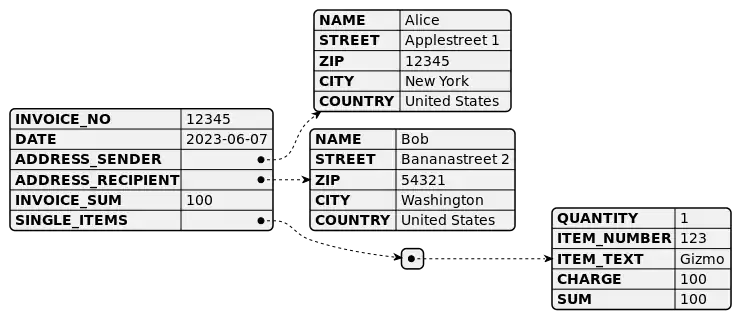 INVOICE │ ├─ INVOICE_NO ├─ DATE ├─ ADDRESS_SENDER │ ├─ NAME │ ├─ NAME │ ├─ STREET │ ├─ ZIP │ ├─ CITY │ └─ COUNTRY ├─ ADDRESS_RECIPIENT │ ├─ NAME │ ├─ NAME │ ├─ STREET │ ├─ ZIP │ ├─ CITY │ └─ COUNTRY ├─ INVOICE_SUM ├─ SINGLE_ITEMS │ ├─ SINGLE_ITEM │ │ ├─ QUANTITY │ │ ├─ ITEM_NUMBER │ │ ├─ ITEM_TEXT │ │ ├─ CHARGE │ │ └─ SUM │ └─ ... ├─ CONDITIONS ...