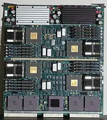 The deskside variant can accept one CPU board, and the rackmount variant can take up to six CPU boards. Both models were launched with the IP19 CPU board with one, two, or four MIPS R4400 CPUs,[3] initially with 100 and 150 MHz options and later increased to 200 and 250 MHz. Later, the IP21 CPU board was introduced, with one or two R8000 microprocessors at 75 or 90 MHz; machines with this board were referred to as POWER Onyx. Finally, SGI introduced the IP25 board with one, two, or four R10000 CPUs at 195 MHz.