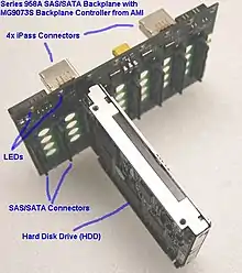 A backplane is a circuit board with connectors and power circuitry into which hard drives are attached; they can have multiple slots, each of which can be populated with a hard drive. Typically the back-plane is equipped with LEDs which by their color and activity, indicate the slot's status; typically, a slot's LED will emit a particular color or blink pattern to indicate its current status.
